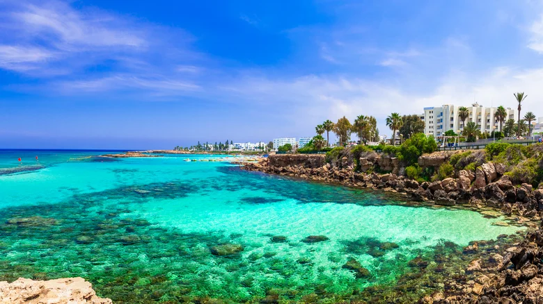 Most of Protaras’ big hotels line the coast around Fig Tree Bay, so you can walk from your room straight to the sand.